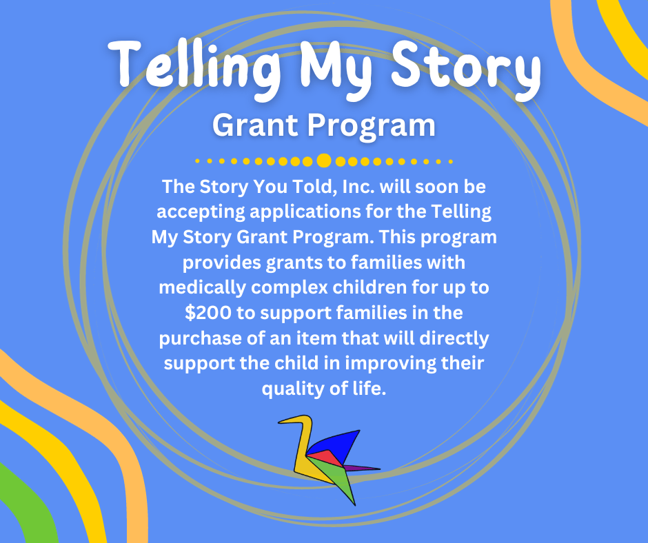 The Story You Told, Inc. is accepting applications for the Telling My Story Grant Program. This program provides grants to families with medically complex children for up to $200 to support families in the purchase of an item that will directly support the child in improving their quality of life.